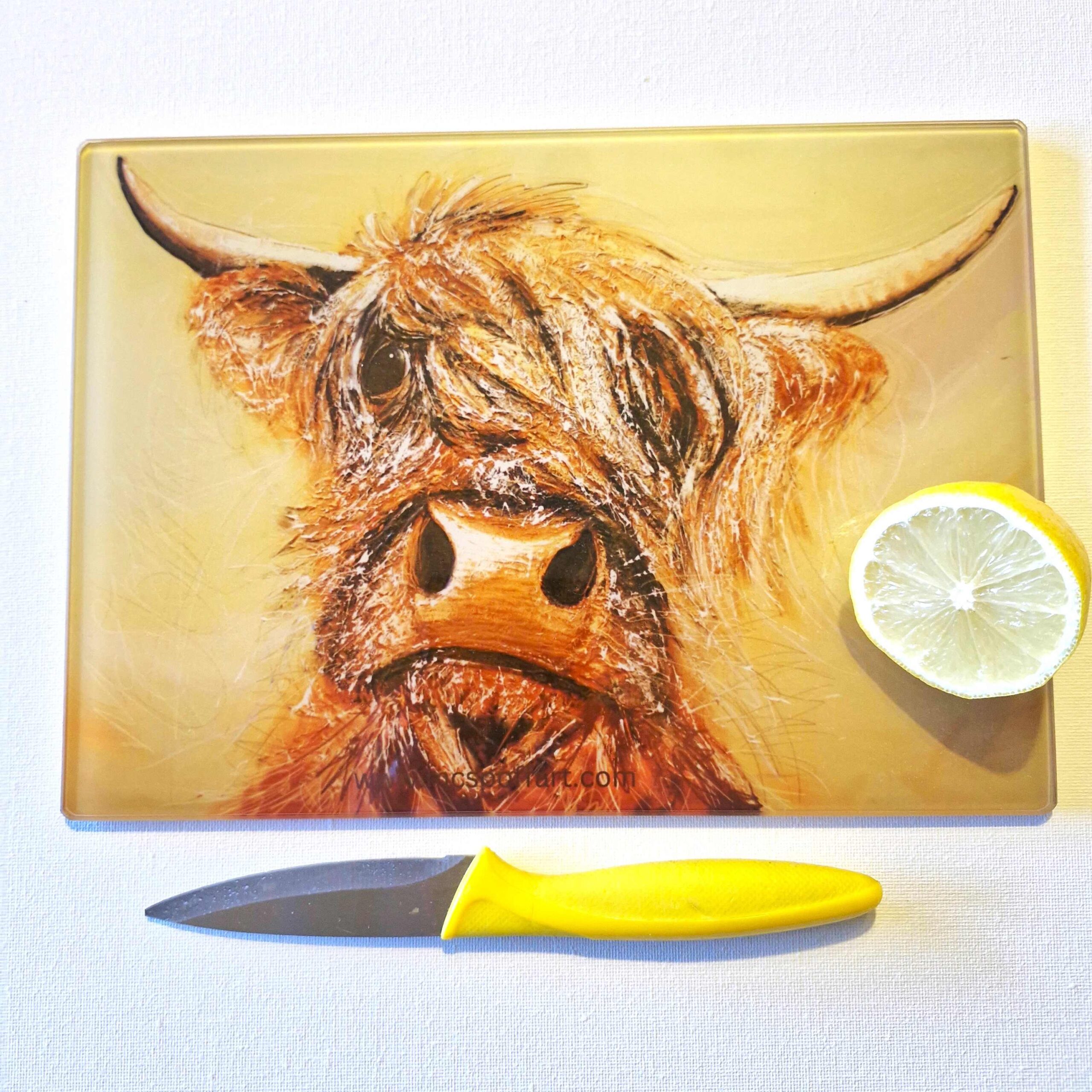 Glass Cutting Board – Windy the Highland Cow- 20cm x 28cm – SMOOTH