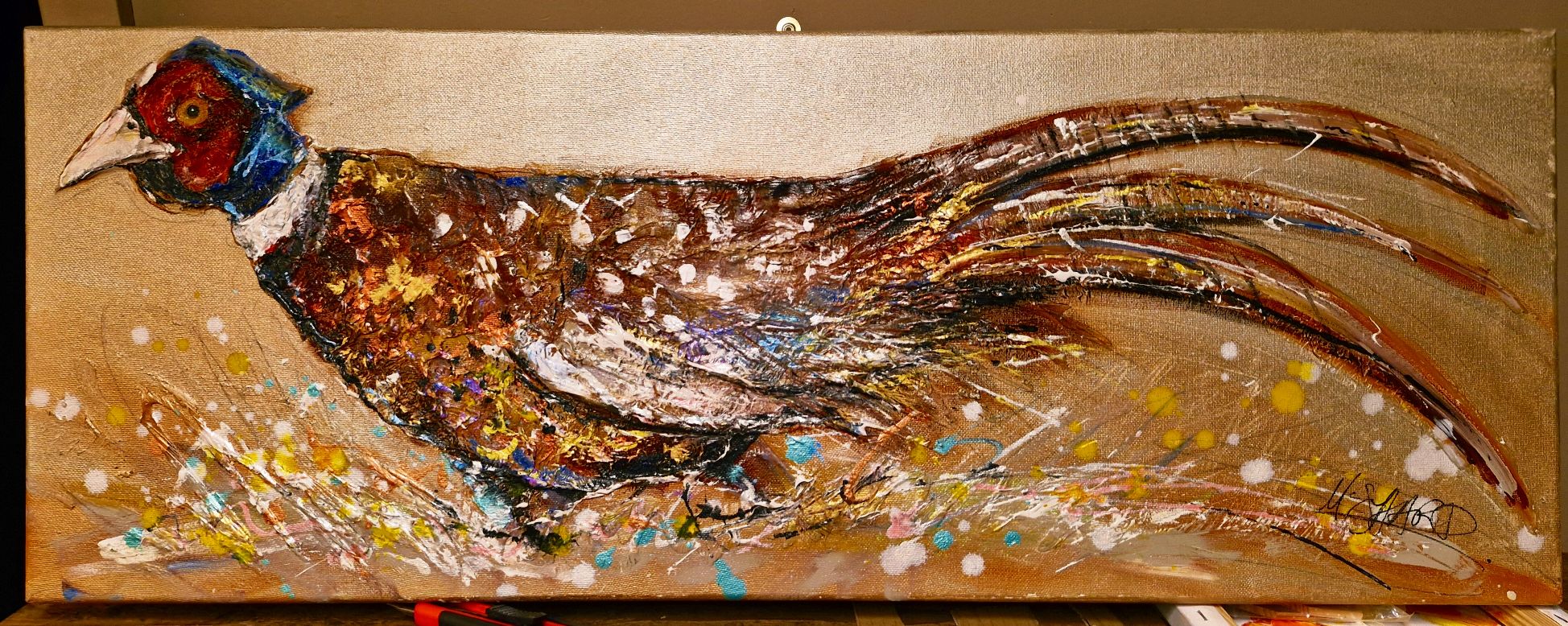 Textured mixed media painting of a pheasant. Lots of paint, papers and feathers create the unique texture